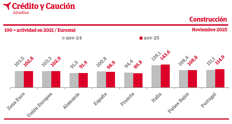 En el mes de noviembre, el Índice de la Actividad de la Construcción decrece en la zona euro.