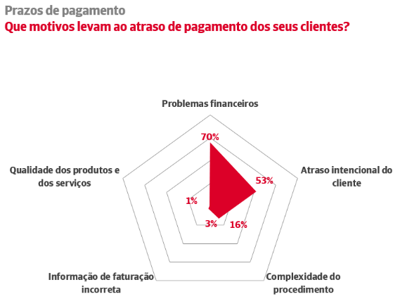 70% das empresas denotam problemas financeiros nos seus clientes. Esta falta de liquidez volta a ser a razão mais citada para explicar a morosidade empresarial, à frente do atraso intencional (53%), da complexidade dos procedimentos de pagamento (16%), da emissão de faturas incorretas (3%) ou das divergências quanto à qualidade dos bens ou serviços fornecidos (1%).