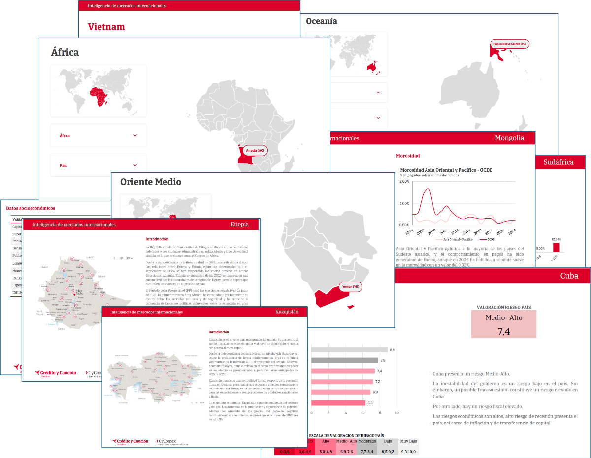 Crédito y Caución, a través del servicio de internacionalización e inteligencia Cycomex, estrena Fichas de Inteligencia de Mercados Internacionales con nuevos mapas ilustrativos y los últimos datos disponibles de un total de 193 países soberanos reconocidos por la ONU. Estos informes especializados están publicados en la web de este servicio: www.cycomex.es, y contienen información detallada para poder identificar los riesgos más allá de la capacidad de pago de los clientes internacionales. Es un servicio exclusivo para asegurados de Crédito y Caución.