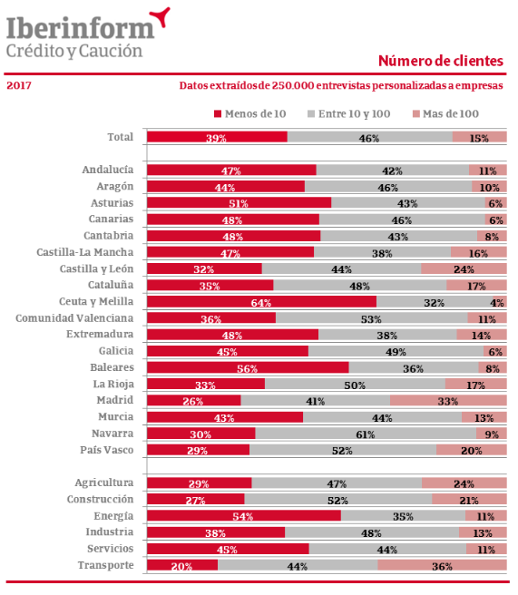 El 39% de las empresas españolas concentra sus riesgos de crédito comercial en menos de diez clientes. El dato procede de las cerca de 250.000 entrevistas que realizó Iberinfom en 2016, para enriquecer la calidad de su información, a los equipos gestores de las empresas españolas, lo que conforma el trabajo de campo más amplio realizado anualmente sobre esta cuestión. Por territorios, el porcentaje más elevado se registra en Ceuta y Melilla (64%), Baleares (56%) y Asturias (51%), Las tasas más bajas de alta concentración se dan en Madrid (26%) y País Vasco (29%).