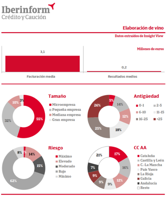 España constituye uno de los primeros viñedos del mundo en extensión. Con casi un millón de hectáreas plantadas, las cerca de 4.000 bodegas españolas están en los primeros puestos de los rankings globales de producción y exportación de millones de hectolitros de vino. Sin embargo, los datos que ofrece Insight View en base a las cuentas financieras presentadas por el sector, confirman la atomización y la competitividad basada en las ventas a granel en el mercado global, con precios y márgenes por debajo de algunos países de nuestro entorno. La facturación media de una bodega española apenas supera los tres millones de euros y los resultados medios se sitúan ligeramente por encima de los 180.000. En este contexto, un 15% de las empresas que componen el sector se mantiene en un segmento de elevado riesgo de impago.