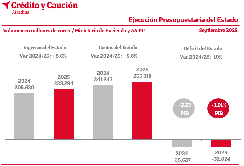 En septiembre de 2025, el déficit del Estado se redujo hasta los 32.024 millones de euros, según los últimos datos publicados por el Ministerio de Hacienda.