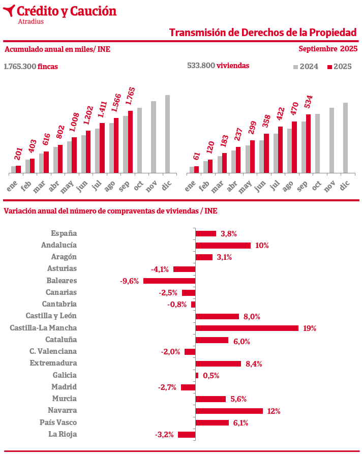 15 de diciembre 2025, datos revisados hasta octubre de 2025 de la Estadística de Transmisión de Derechos de la Propiedad, (INE).