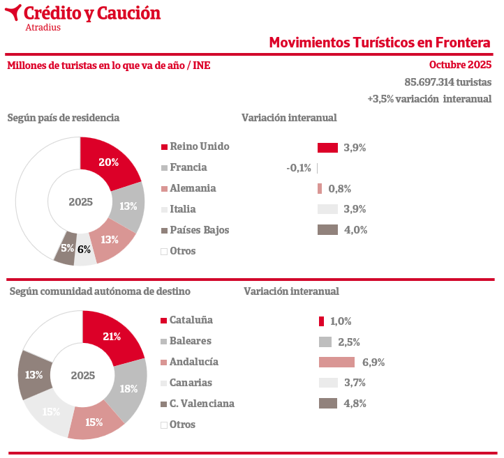 En octubre, España recibió un 3,5% más de turistas internacionales que en el mismo periodo de 2024, según los datos de la Encuesta de Movimientos Turísticos en Frontera.