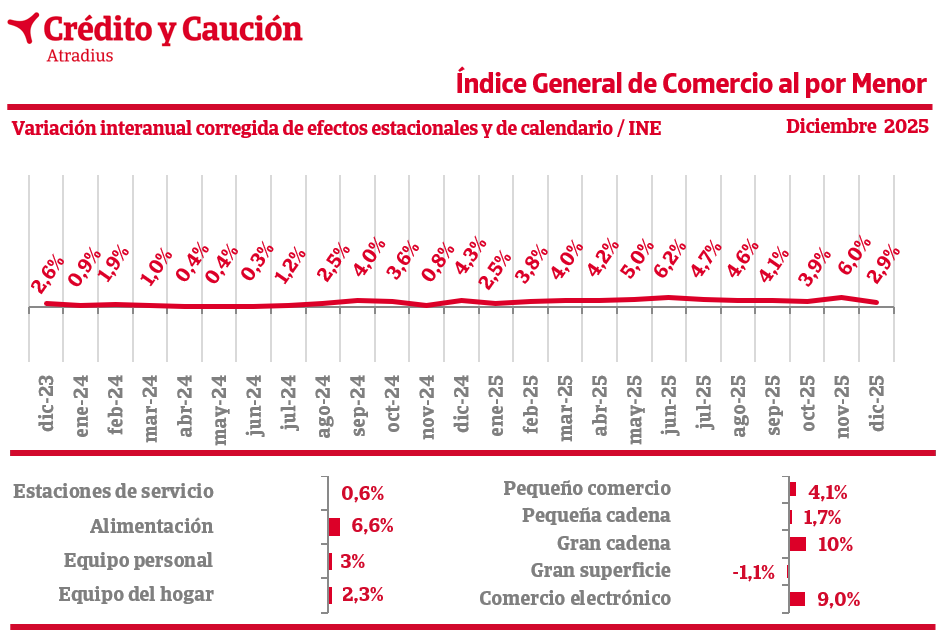 Según los datos del INE, el comercio minorista creció un 2,9% en diciembre respecto al mismo mes de 2024.