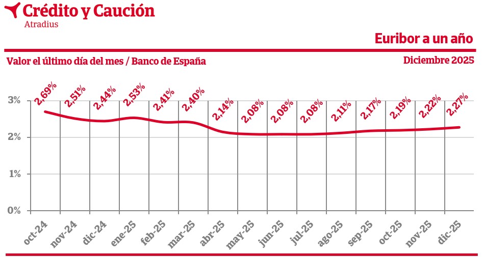 El Banco de España confirma que el Euríbor a 12 meses, referencia en la mayoría de préstamos hipotecarios a tipo variable en España, subió en diciembre al 2,267%.