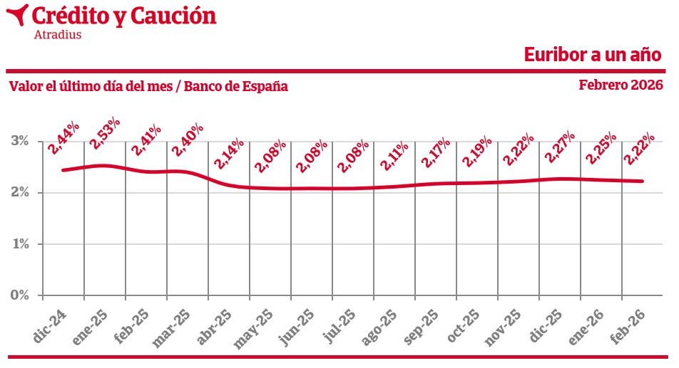 El Banco de España confirma que el Euríbor a 12 meses, referencia en la mayoría de préstamos hipotecarios a tipo variable en España, bajó en febrero al 2,221%.