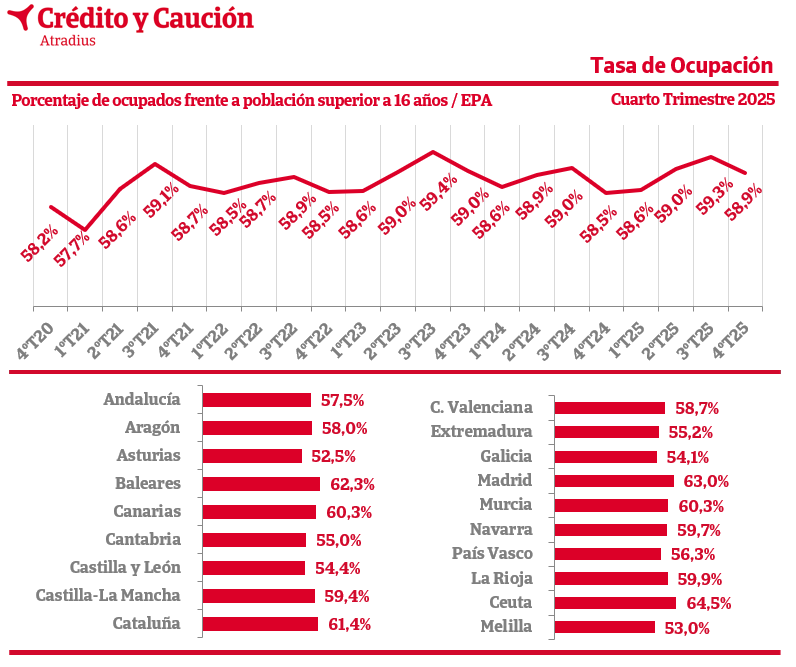 Según los últimos datos de la Encuesta de Población Activa (EPA), en el cuarto trimestre de 2025, la tasa de ocupación disminuyó hasta el 58,9%.