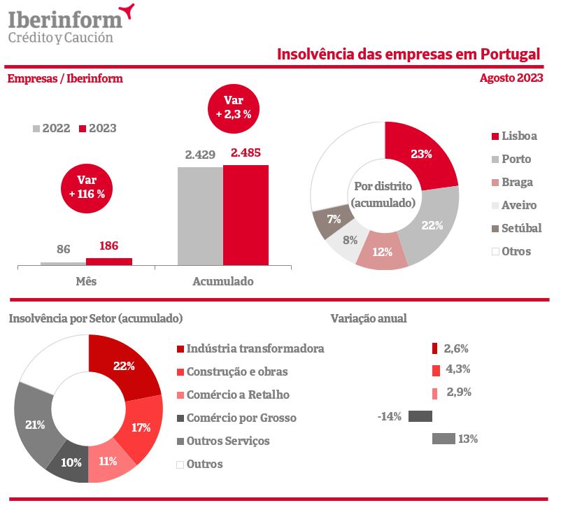 As insolvências em agosto registaram um aumento de 116% face ao mesmo mês do ano passado, confirmado a tendência de crescimento que se começou a verificar na segunda metade do primeiro semestre deste ano. Pela primeira vez em 2023, o acumulado supera o total de 2022, com um aumento de 2,3% e um valor absoluto de 2.485 insolvências.