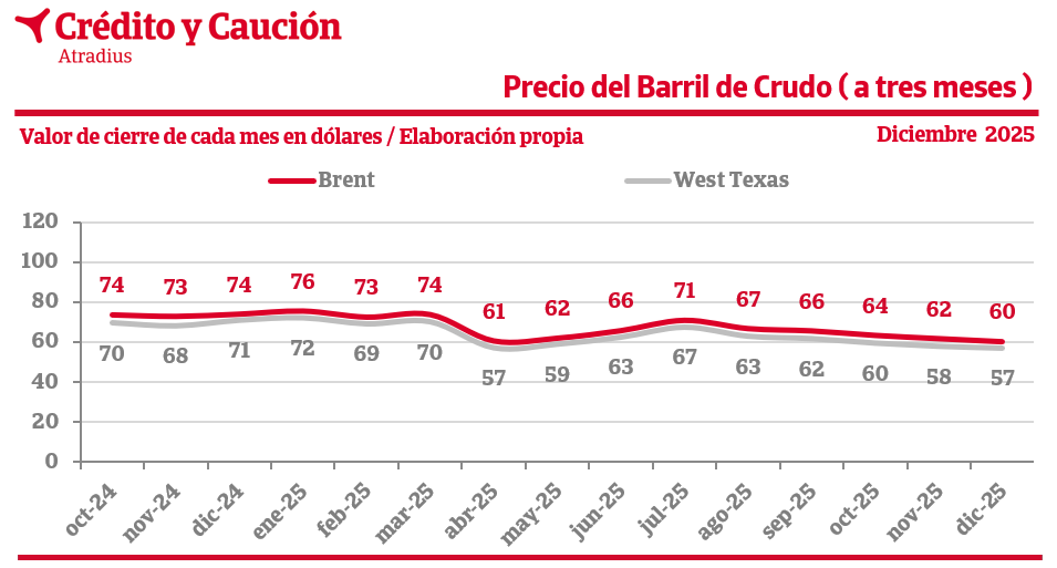 Los precios del barril Brent y West Texas cierran en 60 y 57 dólares, respectivamente, en diciembre de 2025.