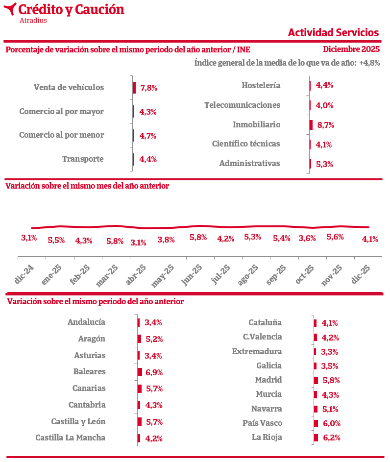 La cifra de negocios del sector servicios en diciembre de 2025 en España crece un 4,8% interanual, según los datos del INE.