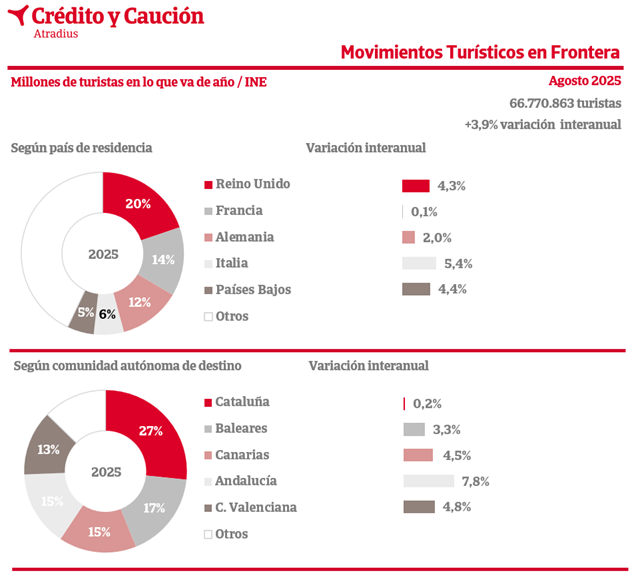 En agosto, España recibió un 3,9% más de turistas internacionales que en el mismo periodo de 2024, según los datos de la Encuesta de Movimientos Turísticos en Frontera.