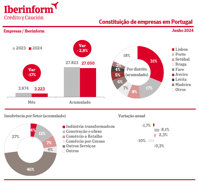 As constituições em junho diminuíram quase 17% face ao mês homólogo do ano passado, com menos 651 novas empresas constituídas. O primeiro semestre de 2024 conta com um total de 27.050 novas empresas constituídas, valor que traduz um decréscimo de quase 3% face ao mesmo período do ano passado.