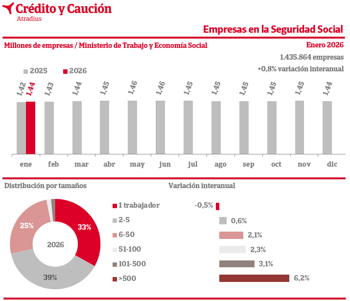 Según los datos de cotización del Ministerio de Trabajo, el número de empresas activas en enero de 2026 varió un 0,8% frente a los valores de hace un año.