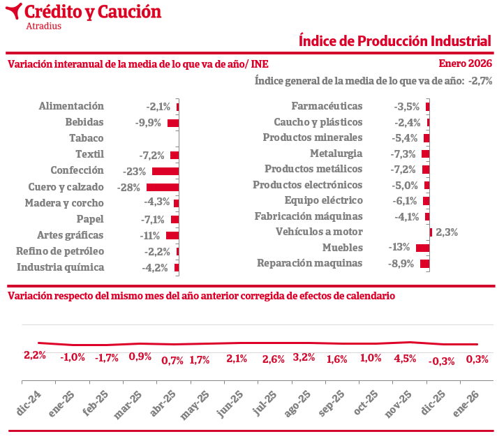 El Índice de Producción Industrial en España, decreció un 2,7% interanual en enero, según los datos del INE.