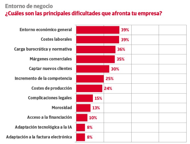 La creciente incertidumbre del entorno económico general es el principal reto que afronta el tejido productivo en su operativa diaria. De acuerdo con el último Estudio de la Gestión del Riesgo de Crédito en España, que impulsan Crédito y Caución e Iberinform, las empresas españolas lo señalan como una de sus máximas problemáticas, junto con el incremento de los costes laborales, en el 39% de los casos. Les siguen en importancia, como principales dificultades las cargas burocráticas y normativas (36%), la escasez de márgenes comerciales (35%), la dificultad para captar nuevos clientes (30%), el incremento de la competencia (25%) y los crecientes costes de producción (24%).