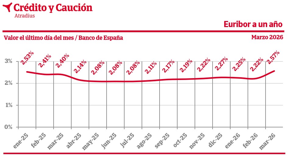 El Banco de España confirma que el Euríbor a 12 meses, referencia en la mayoría de préstamos hipotecarios a tipo variable en España, subió en marzo al 2,565%.