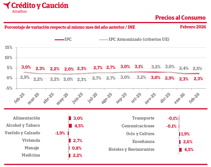 En febrero de 2026, el Índice de Precios de Consumo español (IPC) se sitúa en el 2,3 interanual, según los datos adelantados del INE.