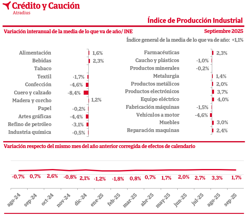El Índice de Producción Industrial en España, creció un 1,1% interanual en septiembre, según los datos del INE.