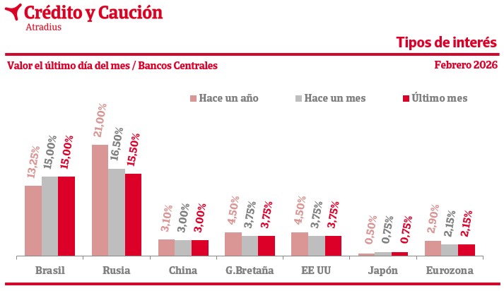 Los principales bancos centrales del mundo mantuvieron los tipos de interés de referencia en febrero. Por el contrario, bajaron en Rusia.