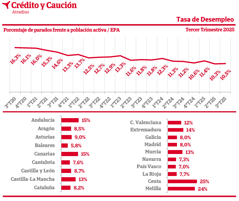 Según los últimos datos de la Encuesta de Población Activa (EPA), en el tercer trimestre de 2025, la tasa de desempleo aumentó hasta el 10,5%.