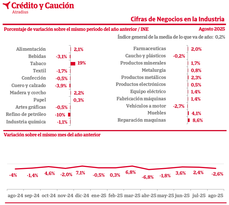 La cifra de negocios de la industria en agosto de 2025 en España crece un 0,2% interanual, según los datos del INE.