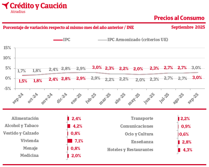 En septiembre de 2025, el Índice de Precios de Consumo español (IPC) se sitúa en el 3% interanual, según los datos del INE. Los alimentos crecen al 2,4%.