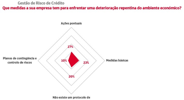 Além disso, a consulta realizada a cerca de 250 gestores de empresas mostra que 20% das empresas não têm qualquer tipo de estratégia preparada face a uma mudança negativa no contexto comercial e económico, o que traz vulnerabilidade à gestão de riscos. Por sua vez, 23% das empresas afirmam ter medidas básicas e 27% afirmam desenvolver ações específicas para contrariar as mudanças negativas na economia.