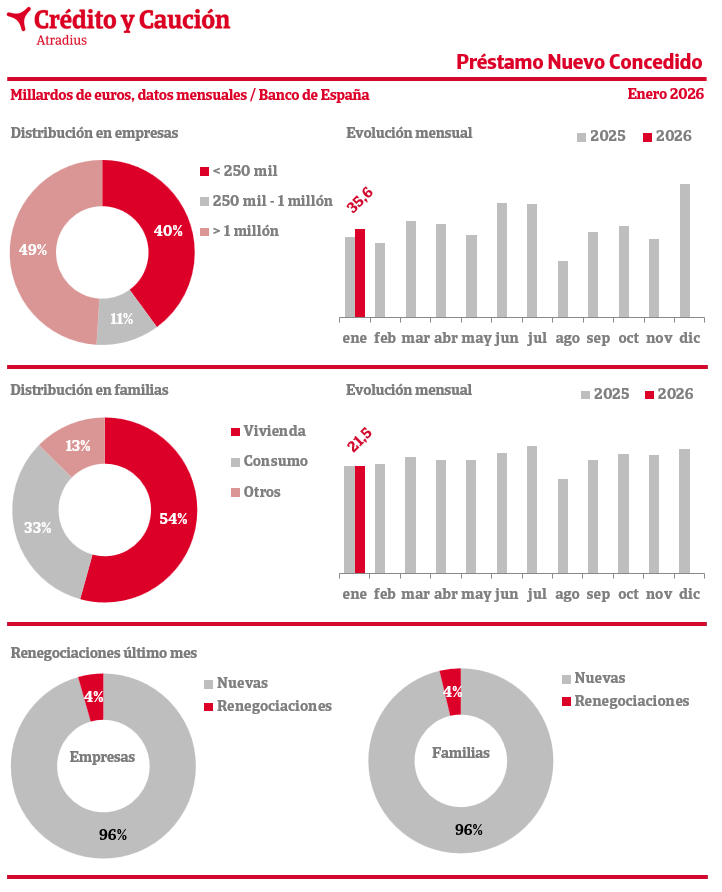 Según datos del Banco de España, en enero de 2026, el crédito nuevo concedido a empresas alcanzó los 35.600 millones de euros, un 11% más que en 2025.