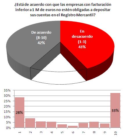 Crédito y Caución e Iberinform han realizado conjuntamente un primer estudio para conocer la opinión de los directivos españoles vinculados a la gestión financiera acerca de la medida. El trabajo de campo ha sido realizado entre los meses de junio y julio de 2011, a través de 497 entrevistas a profesionales relacionados con el Credit Management en sus respectivas organizaciones. Las empresas españolas se muestran muy divididas acerca de las bondades y los problemas que plantea este proyecto legislativo. De cada 10 profesionales entrevistados, cuatro apoyan y cuatro rechazan que las empresas con una facturación inferior al millón de euros estuviese exenta de depositar sus cuentas en el Registro mercantil.