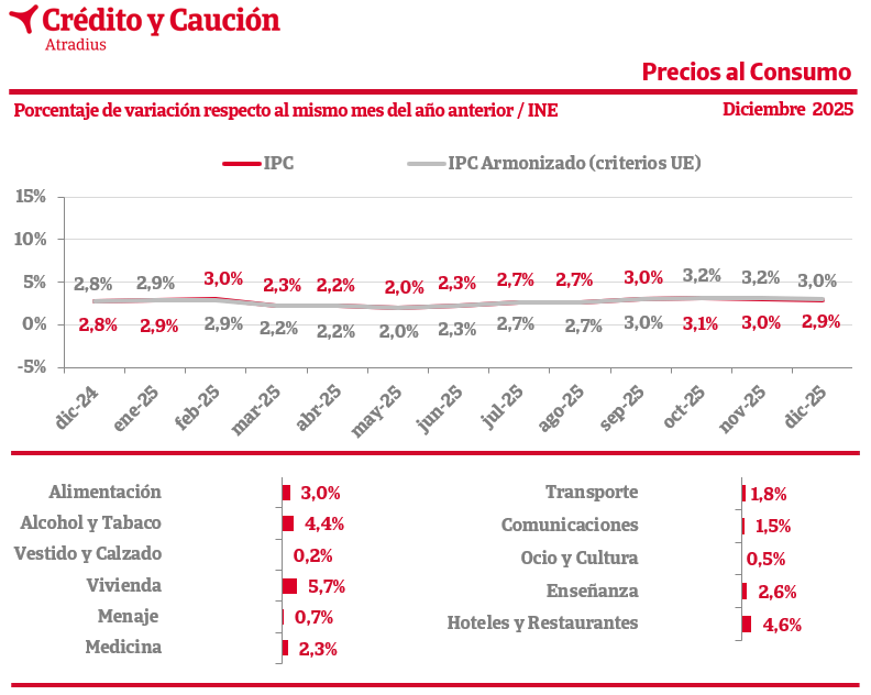 En diciembre de 2025, el Índice de Precios de Consumo español (IPC) se sitúa en el 2,9% interanual, según los datos del INE. Los alimentos crecen al 3%.