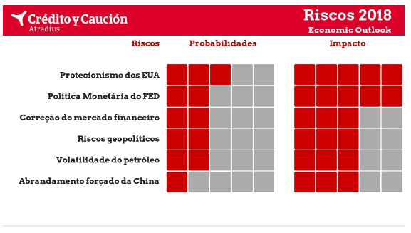 De acordo com o mais recente Economic Outlook divulgado pela Crédito y Caución, os riscos que ameaçam a solidez do crescimento e do comércio global em 2018 aumentaram desde o relatório divulgado na primavera. “Os riscos para as nossas previsões económicas aumentaram nos últimos seis meses. A guerra comercial entre os Estados Unidos e a China mantém-se e a recuperação da bolsa norte-americana começa a fraquejar. O crescimento dos mercados emergentes já está sob pressão devido ao ajustamento feito pela Reserva Federal e a probabilidade de que a política monetária provoque uma turbulência no mercado financeiro mundial continua a aumentar. As tensões geopolíticas crescem à medida que aumenta o risco de um ajustamento para cima no preço do petróleo. O único risco que se reduziu foi o de abrandamento forçado na China”, refere o relatório.