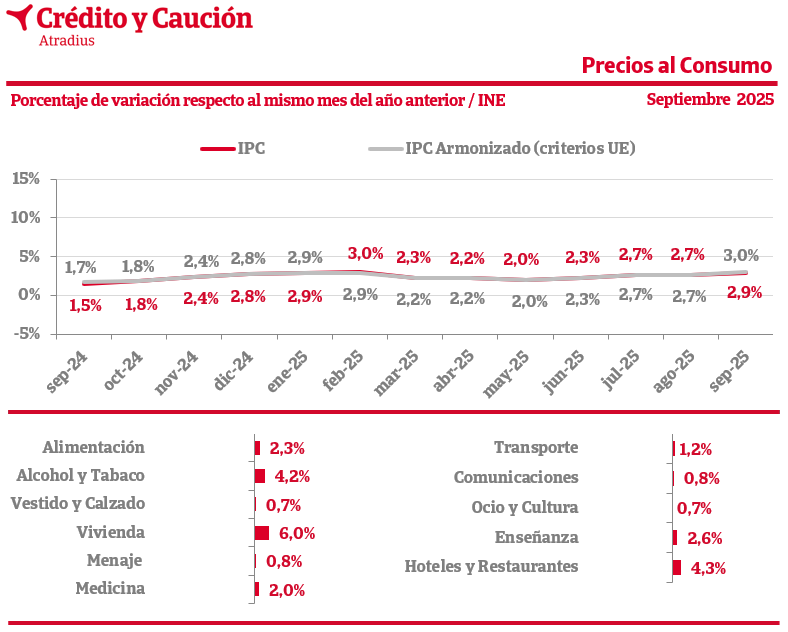 En septiembre de 2025, el Índice de Precios de Consumo español (IPC) se sitúa en el 2,9% interanual, según los datos adelantados del INE.