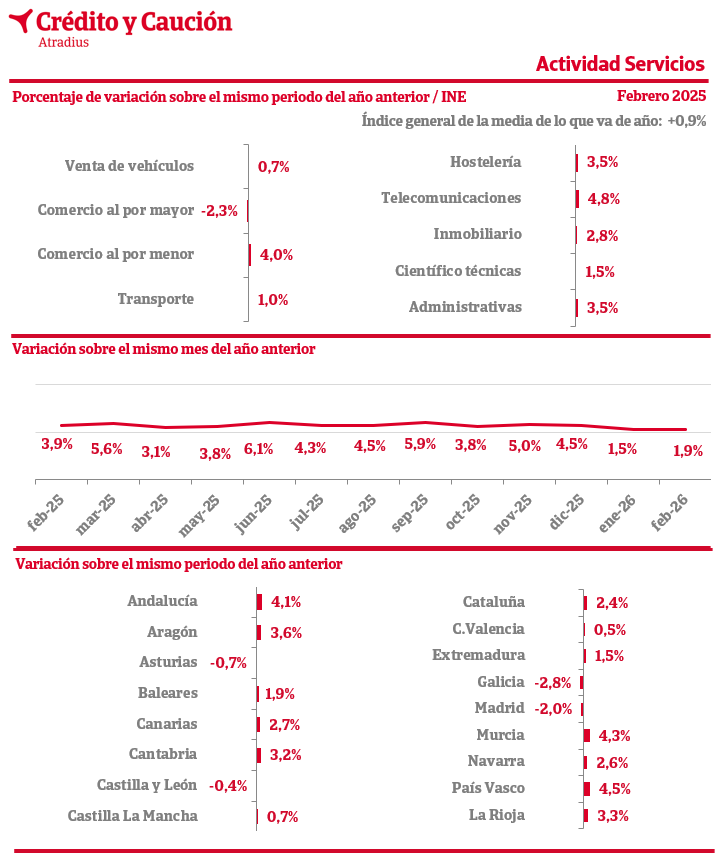 La cifra de negocios del sector servicios en febrero de 2026 en España crece un 0,9% interanual, según los datos del INE.