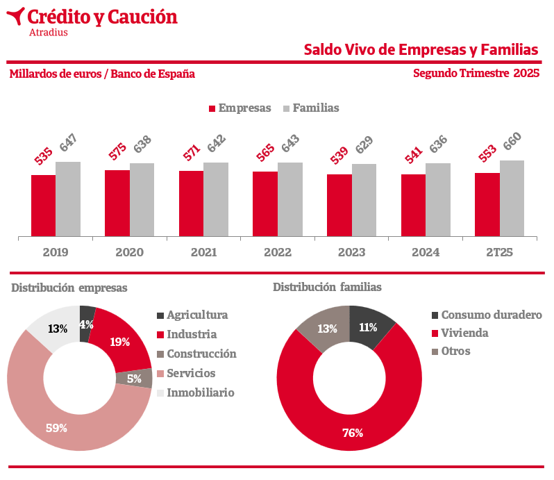 En el segundo trimestre de 2025, el saldo vivo de préstamos a empresas y hogares se situó en 1.220.017 millones de euros, según el Banco de España.