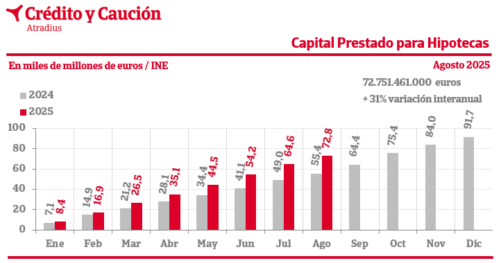 El capital prestado para hipotecas en agosto de 2025 crece un 31% interanual, según los últimos datos del INE.