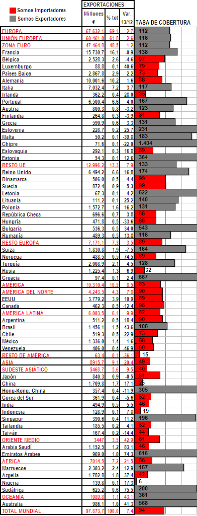 Además del valor oficial [Departamento de Aduanas e Impuestos Especiales de la Agencia Tributaria] de las exportaciones, en millones de euros, CyCnews incluye otros tres parámetros de cada uno de los sectores de producción o mercados de destino: primero, el porcentaje que representa sobre el total de las exportaciones, que permite una primera aproximación a la importancia de su volumen comercial; segundo, el porcentaje de variación interanual, que señala su dinamismo y evolución respecto al año anterior; y tercero, la tasa de cobertura [céntimos de exportación por cada euro que se importa], que permite determinar el estado de la balanza comercial [un valor por debajo de 100 indica que importamos más que exportamos, mientras que por encima de 100 las exportaciones son mayores que las importaciones].