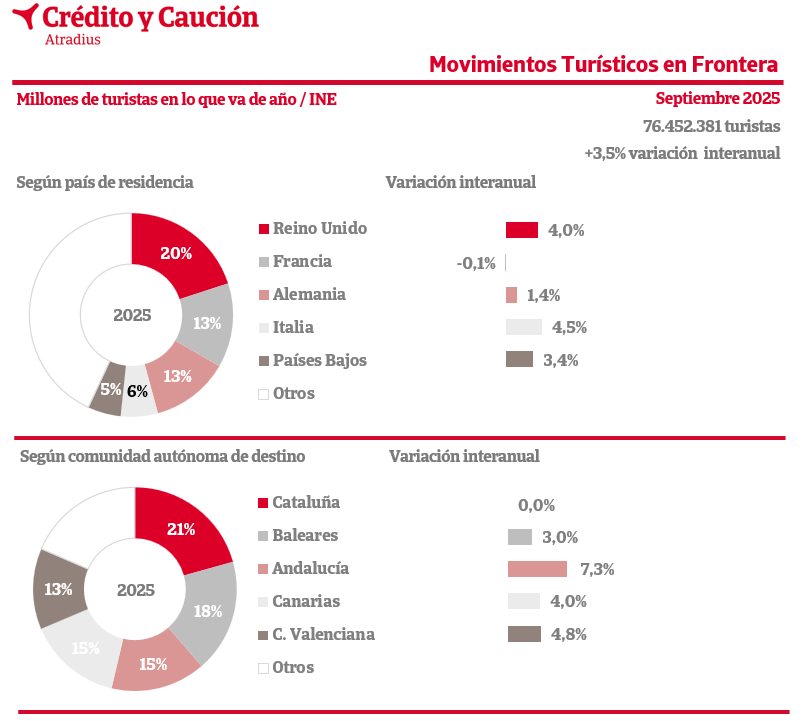 En septiembre, España recibió un 3,5% más de turistas internacionales que en el mismo periodo de 2024, según los datos de la Encuesta de Movimientos Turísticos en Frontera.
