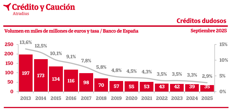Según los datos provisionales extraídos por Crédito y Caución del último Boletín Estadístico que mensualmente publica el Banco de España, en el mes de septiembre de 2025, el volumen de créditos de dudoso cobro sumaba 34.697 millones de euros, lo que situó la tasa de morosidad bancaria en el 2,9% del total de crédito concedido.