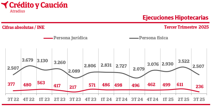 Según los datos del INE, en el tercer trimestre de 2025, las ejecuciones hipotecarias a familias iniciadas e inscritas en los registros de la propiedad suben un 20% en tasa anual.