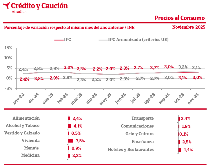 En noviembre de 2025, el Índice de Precios de Consumo español (IPC) se sitúa en el 3% interanual, según los datos adelantados del INE.