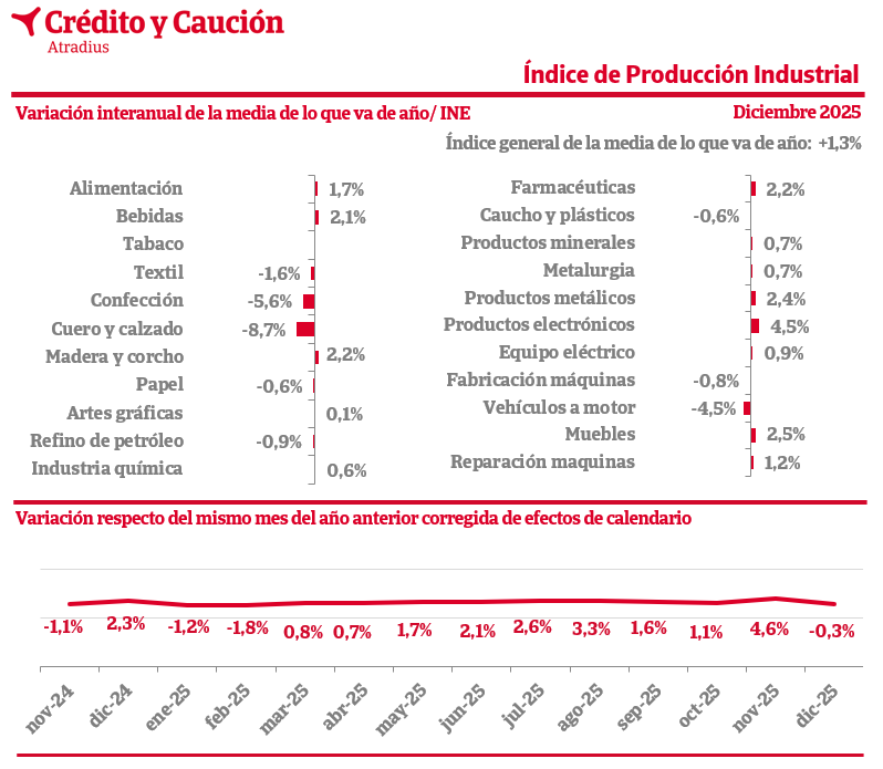 El Índice de Producción Industrial en España, creció un 1,3% interanual en diciembre, según los datos del INE.