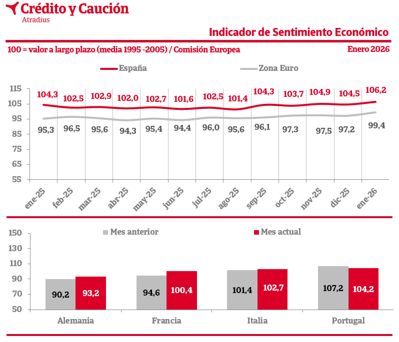 En el mes de enero, el Indicador de Sentimiento Económico (ESI) de la Comisión Europea, en cuya elaboración Crédito y Caución es panelista, crece en Francia (+5,8), Alemania (+3,0), España (+1,7) e Italia (+1,3).