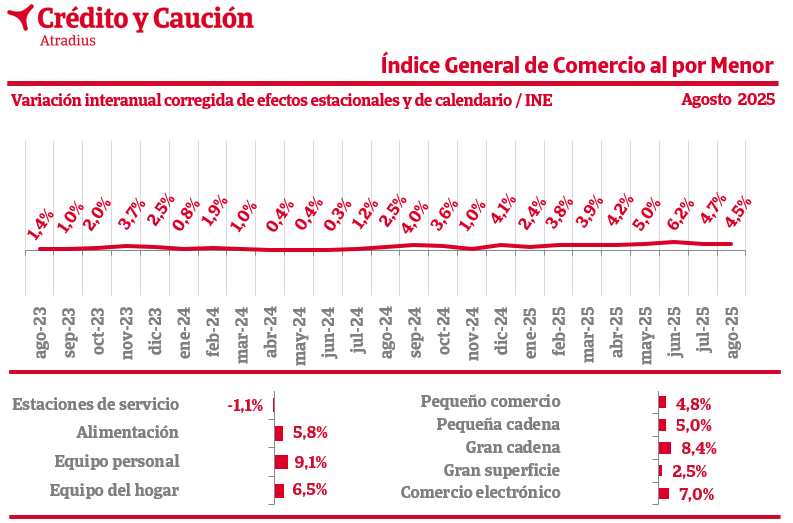 Según los datos del INE, el comercio minorista creció un 4,5% en agosto respecto al mismo mes de 2024.
