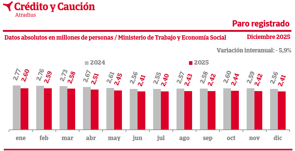 Según los últimos datos del Ministerio de Trabajo y Economía Social, el paro registrado (que no incluye los fijos discontinuos sin actividad) disminuyó un 5,9% interanual.