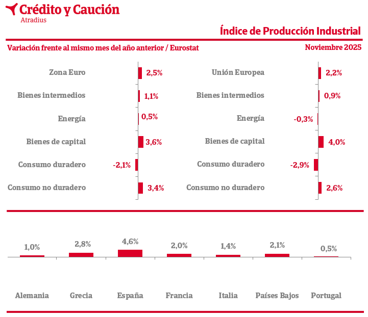 16 de febrero 2026, datos del IPI de diciembre 2025, (Eurostat).