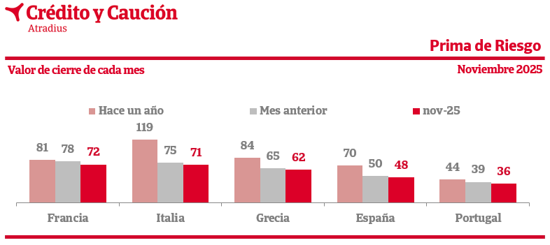 La prima de riesgo puede ser facilmente calculada a partir de la observación del mercado secundario de deuda. La prima de riesgo toma como referencia los bonos a 10 años emitidos por Alemania, la economía percibida como la más segura de la zona euro, y mide el sobreprecio que alcanzan los bonos a 10 años de los otros países en los mercados secundarios de deuda, donde se intercambian libremente. El gráfico muestra la evolución de la prima de riesgo expresada en puntos porcentuales. Se trata, siempre, del valor al cierre de cada mes.