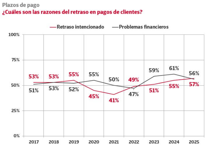 Un 56% de las empresas percibe problemas financieros en sus clientes, cinco puntos porcentuales menos que hace un año. Sin embargo, aumentan los niveles relativos a los retrasos intencionados por parte del cliente, alcanzando el 57% frente al 55% de 2024.