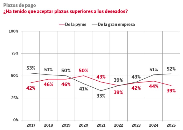La pandemia, correspondiente a las oleadas de 2020 y 2021, mostró un cambio en el comportamiento de los dos principales segmentos empresariales en los que se apoya la economía española. En el caso de las pymes se observó un claro incremento de su imposición de plazos de pago más largos, un síntoma del intento de diluir a través la cadena de valor sus problemas de tesorería. Por contra, esas dos oleadas reflejaron entre las grandes empresas, especialmente en 2021, una estrategia de protección de la salud financiera de sus proveedores. Sin embargo, los datos de 2025 muestran ya un comportamiento en línea con los valores históricos de la serie.