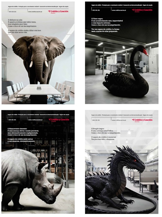 No âmbito financeiro, existem diferentes fenómenos que podem levar a uma crise profunda, especialmente porque surgem de forma inesperada, sem aviso prévio, ou têm estado à espreita há algum tempo, mas são evitados. Saber identificá-los é fundamental para conseguir ativar protocolos de ação e para conceber estratégias de gestão de risco, como o seguro de crédito. Por esta razão, a Crédito y Caución recorreu às figuras animais usadas para representar as possíveis ameaças à atividade das empresas, como o "cisne negro", o "rinoceronte cinzento", o "elefante na sala" ou o "dragão negro".